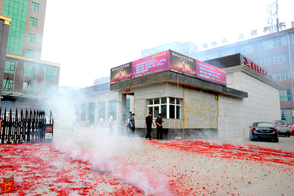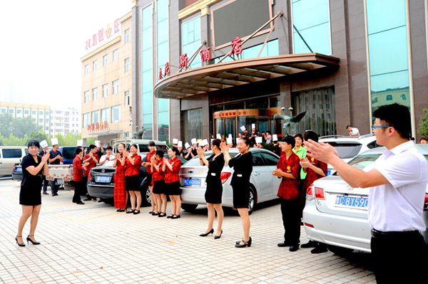 迪尼斯酒店伊川店全體員工在總經(jīng)理劉青平的帶領(lǐng)下,統(tǒng)一著裝,齊聚在酒店大堂門口,在隆隆的鞭炮聲中,共同慶祝迪尼斯酒店伊川店主題婚宴大廳正式開張啟用。