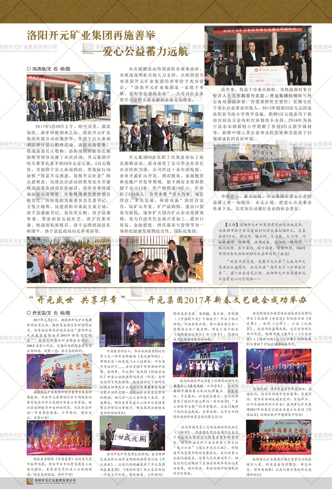 洛陽開元礦業(yè)集團有限公司簡介洛陽開元礦業(yè)集團有限公司,始成立于2006年,位于洛陽市開元大道269號。業(yè)務涉及有色金屬礦山開發(fā)、有色金屬礦產(chǎn)品購銷與進出口貿易、房地產(chǎn)開發(fā)、酒店服務與管理、新能源開發(fā)建設、企業(yè)管理與咨詢、資本投資等多個領域。集團旗下共有十余家全資子公司,主要包括貴州開元礦業(yè)有限公司、興??h銅鑫礦業(yè)有限公司、洛陽集美酒店管理有限公司、北京明峰資本有限公司、北京釋源文化傳媒有限公司、洛陽唐都房地產(chǎn)開發(fā)有限公司等。民建洛陽市委委員、企業(yè)委主任許明月是公司創(chuàng)始人,現(xiàn)任洛陽開元礦業(yè)集團有限公司董事長。在做好企業(yè)經(jīng)營的同時,開元集團始終不忘企業(yè)的社會責任和家國情懷,以突出的愛心公益事跡,開展了一系列公益慈善活動:“民建林”公益事業(yè)通過“思源基金”“幫幫公益”線上公益平臺,與眾多愛心人士籌措資金20余萬元;資助541名貧困大學生共計270余萬元,推進“數(shù)字助力——河南AI人才培養(yǎng)”;捐款10萬元,馳援京津冀、黑龍江洪水地質災害……公司于2017年底被洛陽市慈善總會評為“洛陽慈善風云榜——十大愛心集體”。洛陽開元礦業(yè)集團有限公司秉承持續(xù)發(fā)展理念,憑借多年來良好的企業(yè)信譽與經(jīng)營業(yè)績,與全國多家企業(yè)建立了良好合作關系,受到社會各界的一致好評,多次榮獲“納稅標兵”、“先進企業(yè)”、“招商引資模范企業(yè)”等榮譽稱號。公司本著“以人為本,誠信經(jīng)營,多元發(fā)展,和諧雙贏”的經(jīng)營宗旨,積極回報社會,以礦山開發(fā)、礦產(chǎn)品購銷、進出口貿易為依托,逐步擴大國內礦山企業(yè)投資規(guī)模,著力打造集礦產(chǎn)品開發(fā)與購銷、進出口貿易、資本投資、酒店服務與管理等為一體,持續(xù)健康發(fā)展的綜合性、國際化企業(yè)集團。