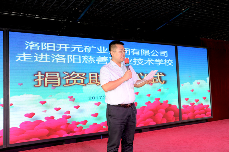 2017年9月21日上午,受許明月董事長(zhǎng)委托,洛陽(yáng)開(kāi)元礦業(yè)集團(tuán)有限公司副總經(jīng)理?xiàng)畲荷?、總?jīng)理助理叢萬(wàn)通、辦公室主任張愛(ài)利及集團(tuán)員工代表赴洛陽(yáng)慈善職業(yè)技術(shù)學(xué)校進(jìn)行捐資助學(xué)活動(dòng),洛陽(yáng)慈善總會(huì)副會(huì)長(zhǎng)兼秘書(shū)長(zhǎng)郝春苑、慈善學(xué)校全體師生及相關(guān)媒體記者等參與了本次活動(dòng)。