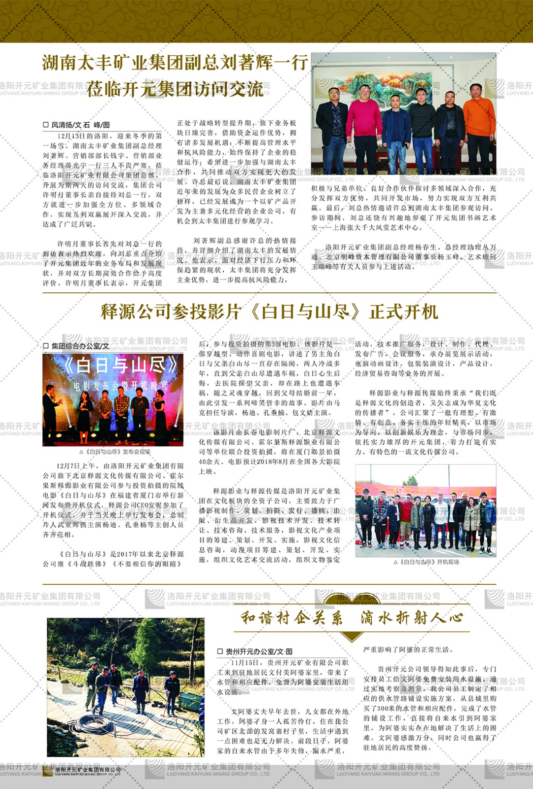 洛陽開元礦業(yè)集團有限公司簡介洛陽開元礦業(yè)集團有限公司,始成立于2006年,位于洛陽市開元大道269號。業(yè)務涉及有色金屬礦山開發(fā)、有色金屬礦產(chǎn)品購銷與進出口貿(mào)易、房地產(chǎn)開發(fā)、酒店服務與管理、新能源開發(fā)建設(shè)、企業(yè)管理與咨詢、資本投資等多個領(lǐng)域。集團旗下共有十余家全資子公司,主要包括貴州開元礦業(yè)有限公司、興??h銅鑫礦業(yè)有限公司、洛陽集美酒店管理有限公司、北京明峰資本有限公司、北京釋源文化傳媒有限公司、洛陽唐都房地產(chǎn)開發(fā)有限公司等。民建洛陽市委委員、企業(yè)委主任許明月是公司創(chuàng)始人,現(xiàn)任洛陽開元礦業(yè)集團有限公司董事長。在做好企業(yè)經(jīng)營的同時,開元集團始終不忘企業(yè)的社會責任和家國情懷,以突出的愛心公益事跡,開展了一系列公益慈善活動:“民建林”公益事業(yè)通過“思源基金”“幫幫公益”線上公益平臺,與眾多愛心人士籌措資金20余萬元;資助541名貧困大學生共計270余萬元,推進“數(shù)字助力——河南AI人才培養(yǎng)”;捐款10萬元,馳援京津冀、黑龍江洪水地質(zhì)災害……公司于2017年底被洛陽市慈善總會評為“洛陽慈善風云榜——十大愛心集體”。洛陽開元礦業(yè)集團有限公司秉承持續(xù)發(fā)展理念,憑借多年來良好的企業(yè)信譽與經(jīng)營業(yè)績,與全國多家企業(yè)建立了良好合作關(guān)系,受到社會各界的一致好評,多次榮獲“納稅標兵”、“先進企業(yè)”、“招商引資模范企業(yè)”等榮譽稱號。公司本著“以人為本,誠信經(jīng)營,多元發(fā)展,和諧雙贏”的經(jīng)營宗旨,積極回報社會,以礦山開發(fā)、礦產(chǎn)品購銷、進出口貿(mào)易為依托,逐步擴大國內(nèi)礦山企業(yè)投資規(guī)模,著力打造集礦產(chǎn)品開發(fā)與購銷、進出口貿(mào)易、資本投資、酒店服務與管理等為一體,持續(xù)健康發(fā)展的綜合性、國際化企業(yè)集團。