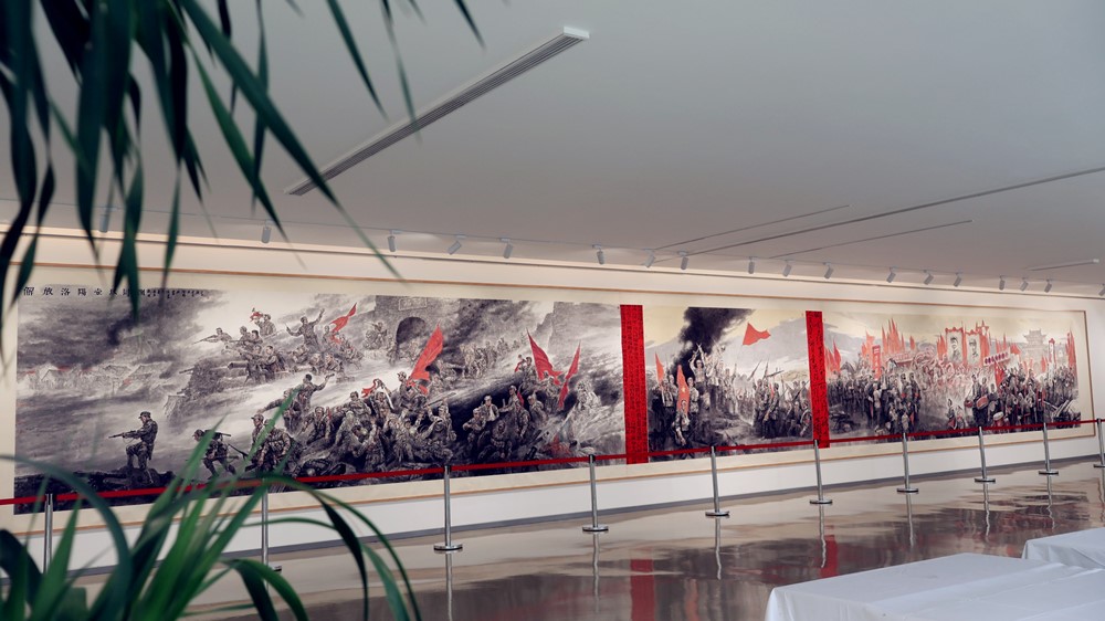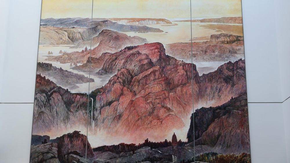 美術(shù)館內(nèi)部空間布局精妙,設(shè)有兩個專業(yè)展廳,總面積達(dá)1500平方米,為藝術(shù)家與觀眾搭建了一個交流、品鑒與靈感碰撞的平臺。其中,高達(dá)13.8米的穹庭懸掛著侯震老師的油畫巨制——《天下之中 九派莽莽》。這幅作品尺寸為11.8m×11.8m,以其宏大的敘事、細(xì)膩的筆觸和深邃的意境牢牢抓住大家的視線,成為每一位踏入美術(shù)館的訪客不可錯過的視覺盛宴。